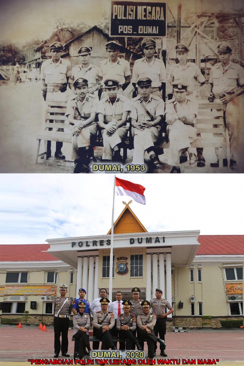 DUMAI (DNN) – Viral di Media Sosial, foto perkembangan penampilan personil Polri dan bangunan Markas Komando Kepolisian Resor (Polres) Dumai dari Tahun 1953 hingga Tahun 2020. Foto kilas balik 67 Tahun silam tersebut menjadi bukti bahwa Pengabdian Polri tak lekang oleh waktu dan masa.