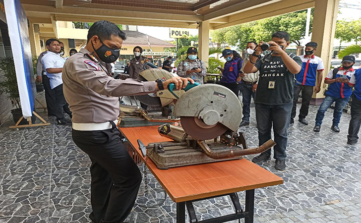 PEKANBARU (DNN) – Satuan Lalulintas (Satlantas) Polresta Pekanbaru musnahkan 563 knalpot Brong atau Racing di Mapolresta Pekanbaru, Senin, 25 Januari 2021.