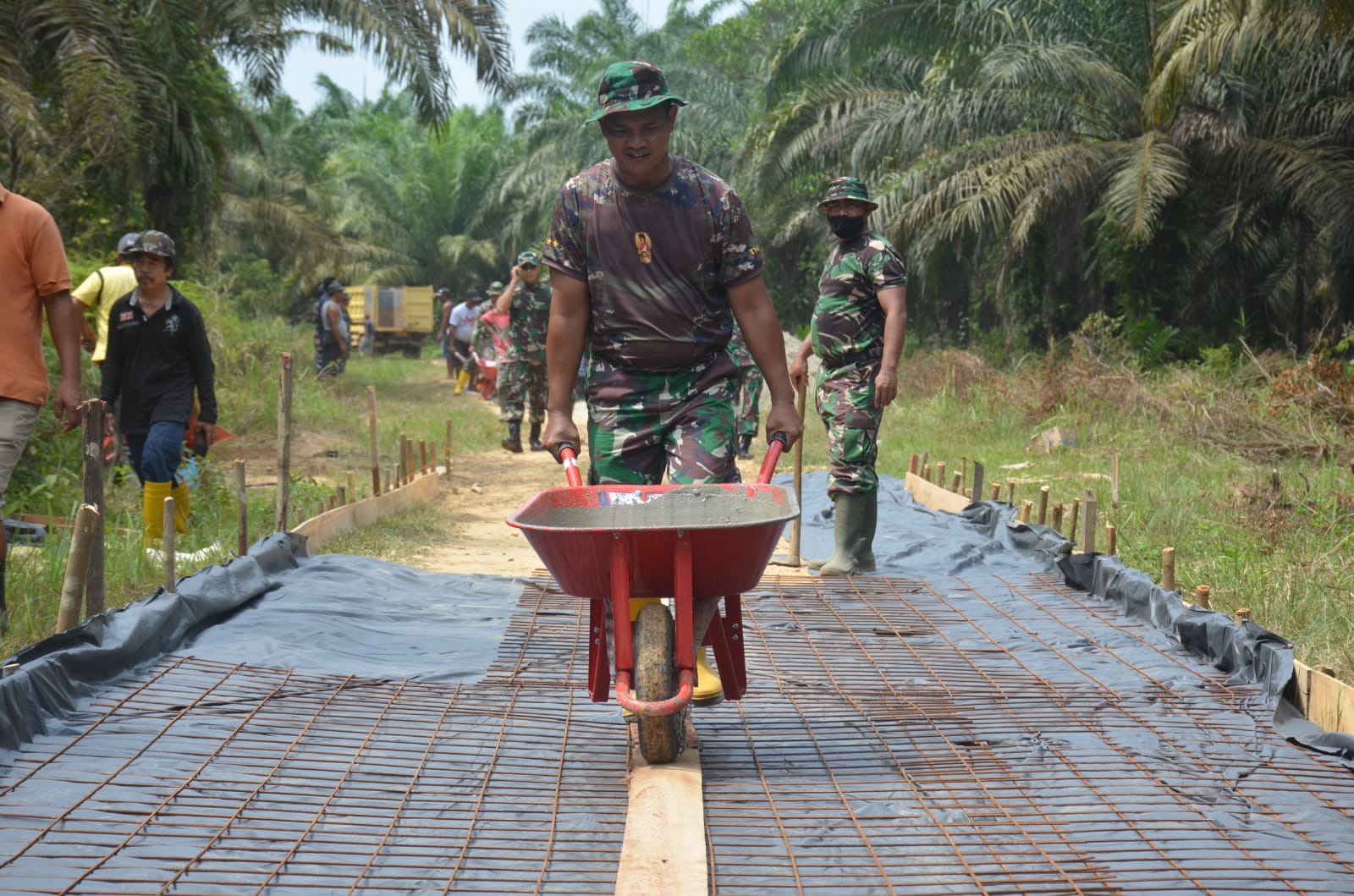 Bahkan, Ketua RW005 Rustam Dolok Saribu dan perangkan RT turut hadir bersama warga sekitar guna membantu Satgas TMMD dimasa Pra-nya. Satu persatu semen cor dalam gerobak diboyong dan ditumpahkan pada permukaan tanah yang telah dilapisi plastik dan diperkuat dengan cetakan mal serta rakitan besi sebagai tulangnya.
